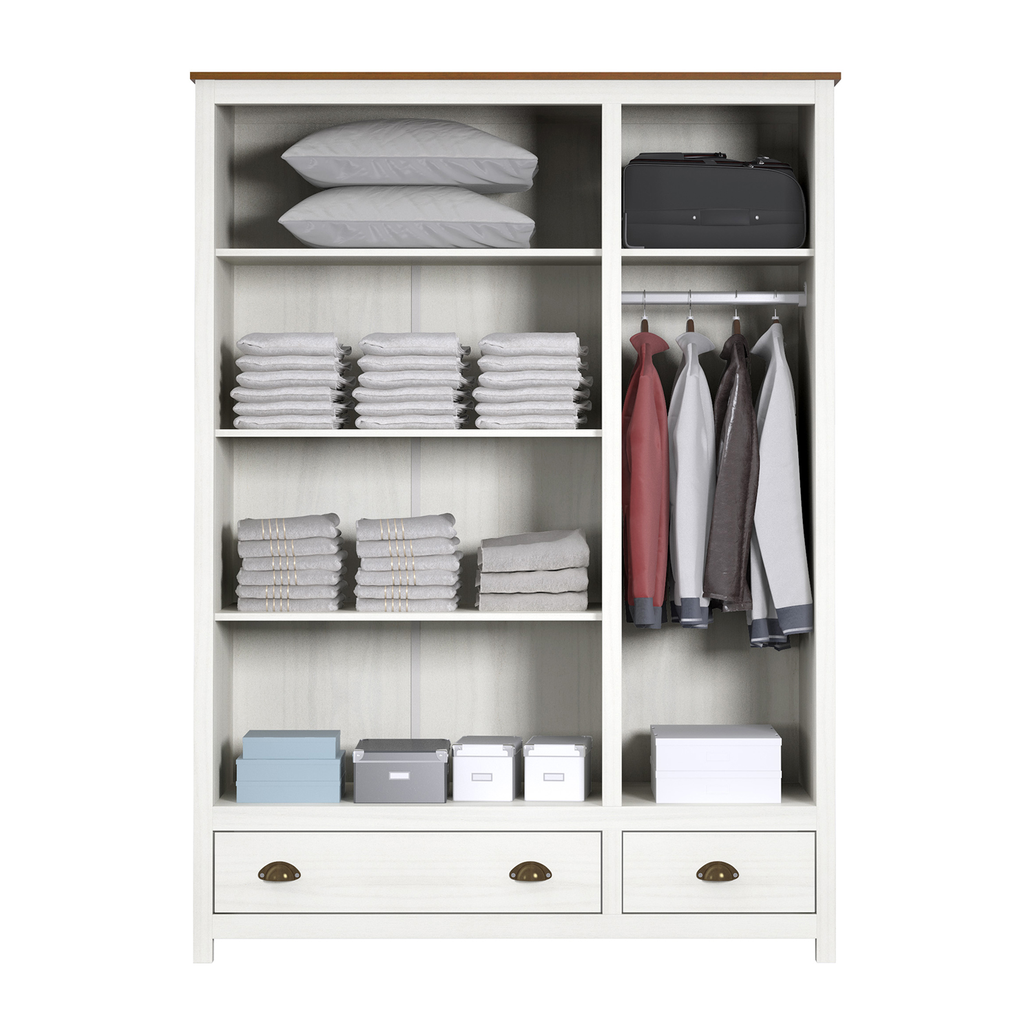 Produktcode: 206281Material Kiefer massiv, Farbe weiß / braun lackiert zwei Schubladen mit Metallgriffen und Führungen 3 Einlegeböden im linken Teil, 1 Einlegeboden im rechten Teil und eine Garderobenstange aus Metall passender Zubehörauszug TOPAZIO 206953