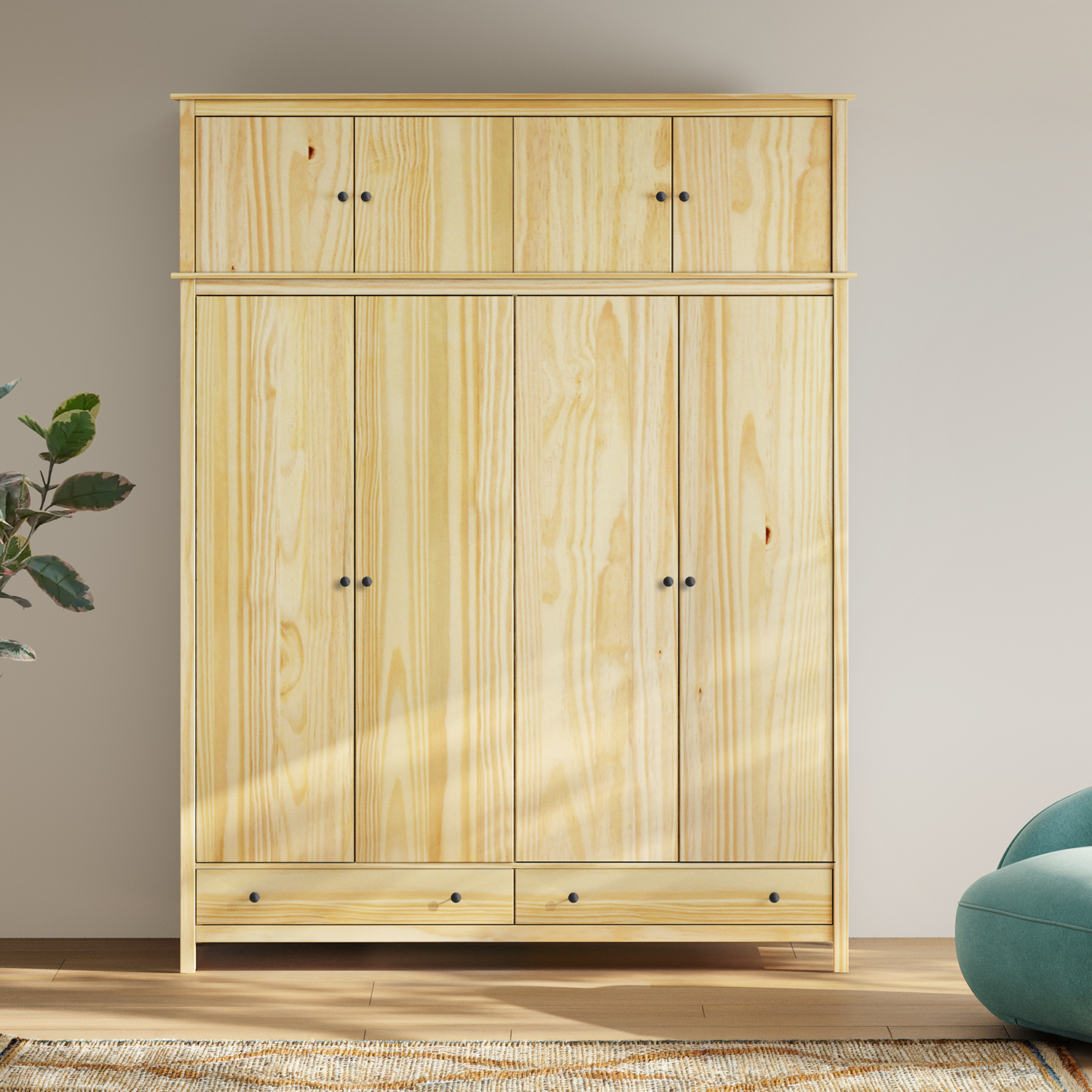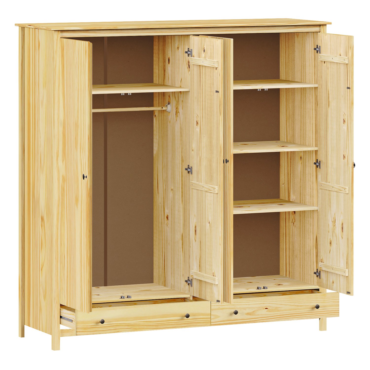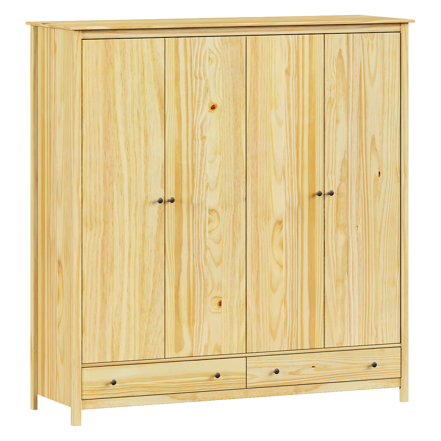 Der viertürige Kleiderschrank TORINO in lackierter Ausführung bietet eine abwechslungsreiche Kombination aus Platz und ruhigem Design. Aus massivem Kiefernholz gefertigt, wirkt er solide und natürlich, und seine Oberfläche mit leichtem Glanz unterstreicht die natürliche Maserung des Holzes. Zwei Innenfächer hinter den Türen bieten reichlich Platz für eine Vielzahl von Kleidungsstücken oder saisonalen Accessoires und ermöglichen es Ihnen, nach Ihrem Geschmack zu organisieren. Die Metallgriffe setzen einen subtilen Kontrast und ermöglichen ein bequemes Öffnen ohne unnötige Dekoration. Mit seiner Größe und seinen Proportionen passt der Schrank in Schlafzimmer, Flur oder Ankleidezimmer, ohne den Raum zu erdrücken. Seine schlichte Erscheinung schafft visuelle Ruhe, aber er ist keine leere Dekoration. Jedes Detail ist gut durchdacht und macht im täglichen Gebrauch Sinn. Im Inneren ist viel Platz für Mäntel, Hemden und Pullover sowie für Kisten und Behälter, ohne dass man sich überladen fühlt. Das natürliche Kiefernholz vermittelt einen warmen Eindruck und bringt Harmonie in den Innenraum. Die lackierte Oberfläche ist pflegeleicht und schützt das Holz vor normaler Abnutzung und Flecken. So hält der Schrank dem täglichen Gebrauch stand und sieht trotzdem ordentlich aus. Dieses Möbelstück ist mehr als nur ein Stauraum. Es ist ein Begleiter, der für Ordnung sorgt und eine unaufdringliche Dekoration für den Raum bleibt. Der Kleiderschrank TORINO ist für alle, die Wert auf Zweckmäßigkeit, Qualität und zeitlose Optik legen. Er ist eine Investition in Ordnung und Wohnlichkeit, die Sie mit Funktion und dezentem Design begeistern wird.