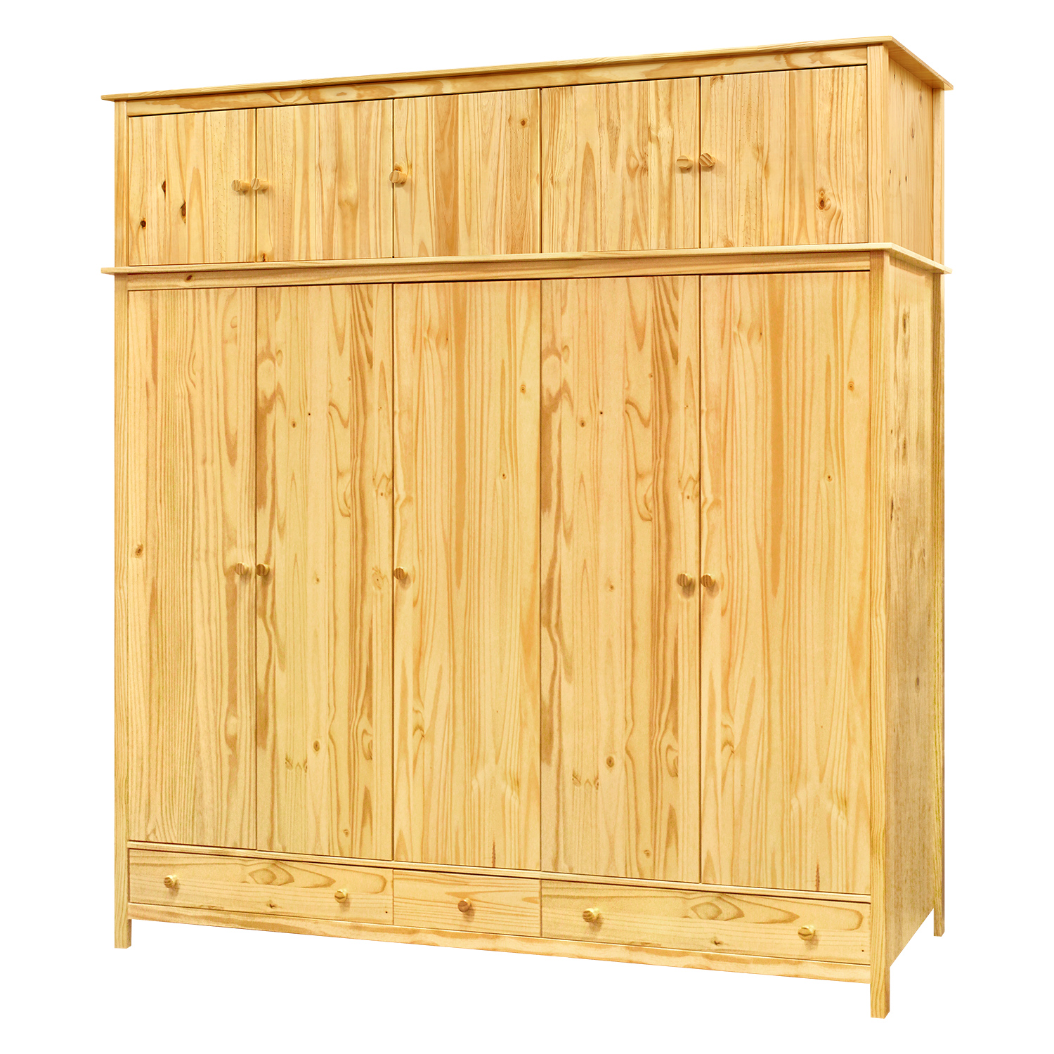 Wenn Sie eine große Familie sind oder einfach nur Mode lieben und viele Kleider haben, könnte der 5-türige Kleiderschrank TORINO Sie zufriedenstellen. Er ist aus massivem Kiefernholz gefertigt und lackiert. Das Raumangebot des Schranks ist im Verhältnis 2:1:2 gehalten. Im linken und rechten breiteren Teil befinden sich eine geräumige Kleiderstange und Einlegeböden für saisonale Kleidung oder Hüte. An der Garderobenstange können Sie dann Kleider, Mäntel, Jacken oder Hemden aufhängen. Im mittleren schmalen Teil befinden sich 3 Einlegeböden zur Aufbewahrung von T-Shirts und Pullovern. Im unteren Teil befinden sich 3 Schubladen mit Metallschienen, in denen Sie wiederum Ihre Unterwäsche aufbewahren können. Da der Schrank wirklich sehr geräumig ist, finden Sie darin bestimmt auch Platz für Bettwäsche. Er wird nicht nur in einem Landhaus oder einer Hütte, sondern auch in einem modernen Haus gut aussehen.