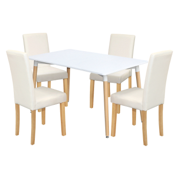 Produktcode: 4543Esstisch ONE 3152 und 4 Esszimmerstühle PRIMA 3037 Tisch: Platte MDF, Farbe weiß Metallgestell, Farbe weiß runde Beine, Material Buche massiv Stühle: Lederbezug - Kunstleder, Farbe weiß Beine Massivholz, klar lackiert, Sitzhöhe 47 cm Tischabmessungen (B/H/H) 140 × 90 × 74 cm Abmessungen der Stühle (B/H) 45 × 55 × 90 cm
