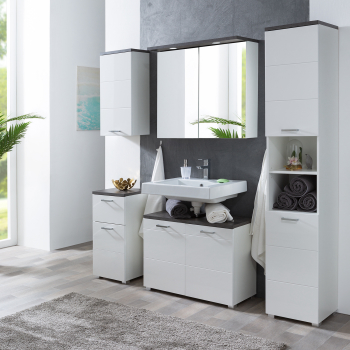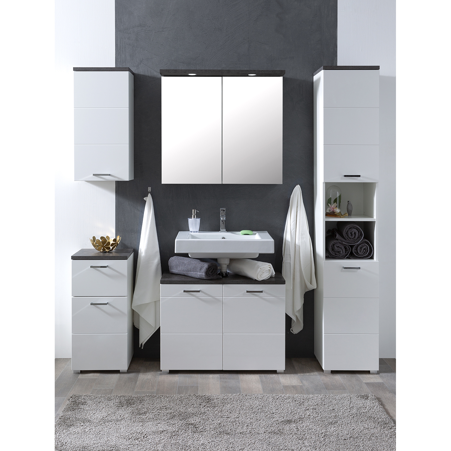 Ein Spiegel ist ein unverzichtbarer Bestandteil jeder Wohnung, ob er nun im Schlafzimmer, im Flur oder im Badezimmer steht. Wer möchte nicht immer gut aussehen? Ein Hängespiegelschrank ist da eine noch bessere Lösung, denn er bietet neben einem Spiegel mit Beleuchtung auch Stauraum. Der Hängeschrank PRAYA 73 in Weiß / Betonimitat dunkel ist eine buchstäblich präskriptive Art, sein Äußeres zu verschönern, denn auf den Ablagen können Sie Kamm, Rasier- oder Haargummis sowie dekorative Kosmetik verstauen. Der Hängeschrank PRAYA 73 lässt sich gut mit anderen PRAYA-Schränken im gleichen Farbschema kombinieren. Machen Sie sich hübsch, bevor Sie das Haus verlassen, schminken und frisieren Sie sich, dann wird Ihnen nicht nur der Spiegel sagen, dass Sie die Schönste sind.