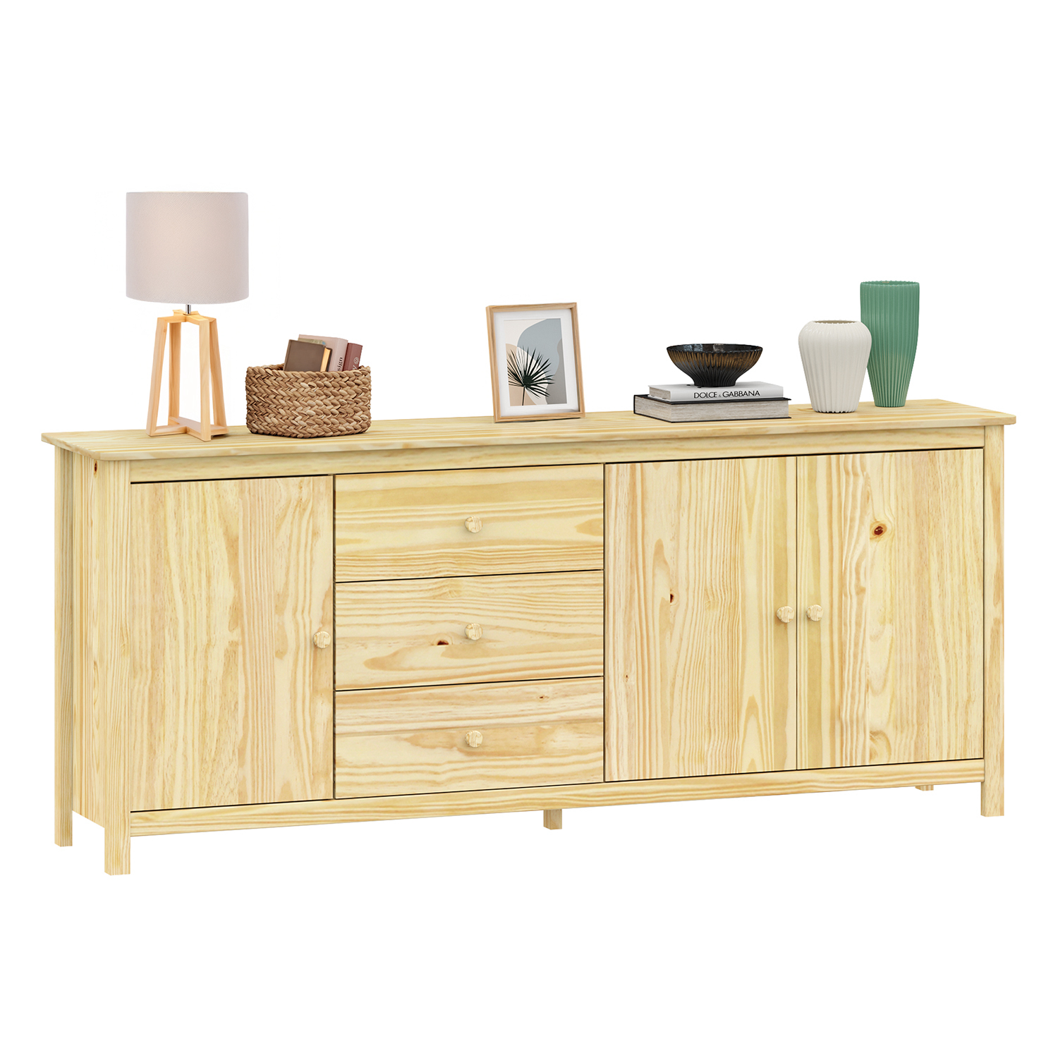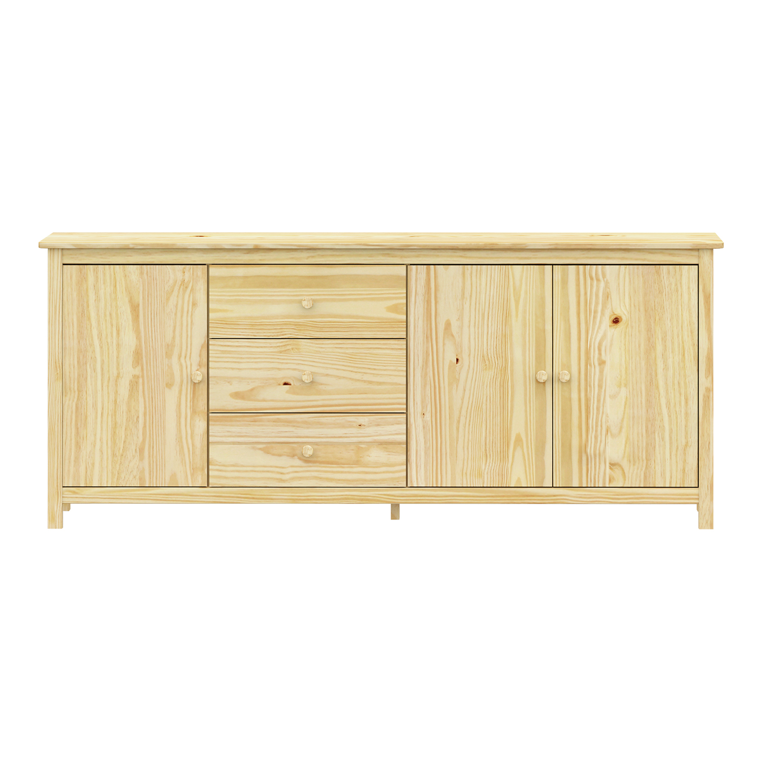 Die Kommode TORINO mit drei Türen und drei Schubladen ist eine ideale Kombination aus natürlichem Aussehen und praktischer Funktionalität. Sie ist aus hochwertigem massivem Kiefernholz gefertigt, das Stärke und Haltbarkeit garantiert. Die lackierte Oberfläche hebt die natürliche Maserung des Holzes hervor und schützt das Material vor der täglichen Abnutzung. Der feine Glanz des Lacks verleiht dem Möbel einen eleganten Touch und macht es pflegeleicht: Einfach den Staub abwischen und die Kommode bleibt schön. Die drei geräumigen Schubladen lassen sich dank solider Metallschienen leichtgängig öffnen und bieten viel Platz für die Aufbewahrung von Kleinteilen und Dokumenten. Hinter dem Türentrio befindet sich ein unterteilter Stauraum mit Einlegeböden, in dem Sie Kleidung, Wäsche oder andere Dinge, die Sie griffbereit und dennoch gut versteckt aufbewahren möchten, ordentlich verstauen können. Mit einer Breite von 190 Zentimetern bietet die Kommode viel Platz, ohne klobig zu wirken. Das Design der Kommode basiert auf klaren Linien und einer einfachen Form, so dass sie sich sowohl mit modernen als auch mit klassischen Einrichtungen kombinieren lässt. Das massive Kiefernholz verleiht dem Raum eine warme und natürliche Ausstrahlung, die ein gemütliches Zuhause schafft. Die Lackierung hebt die Struktur des Holzes hervor und verhindert das Eindringen von Feuchtigkeit, was die Lebensdauer des gesamten Möbelstücks verlängert. Die Kommode TORINO wird nicht nur zu einer praktischen Aufbewahrungslösung, sondern auch zu einem auffälligen ästhetischen Element in Ihrem Wohn-, Schlaf- oder Esszimmer. Sie bringt Harmonie, Eleganz und einen angenehmen natürlichen Charakter in den Raum, den jeder zu schätzen weiß, der Qualitätsmöbel mit langer Lebensdauer und zeitlosem Aussehen sucht.