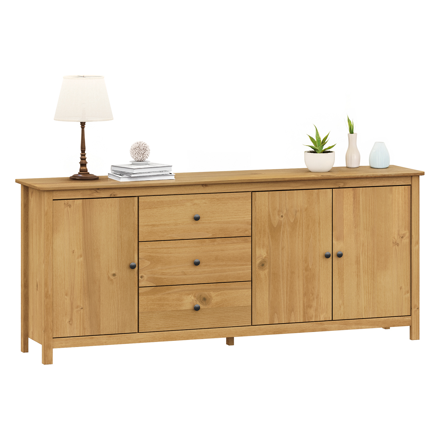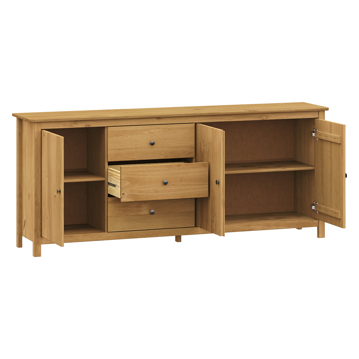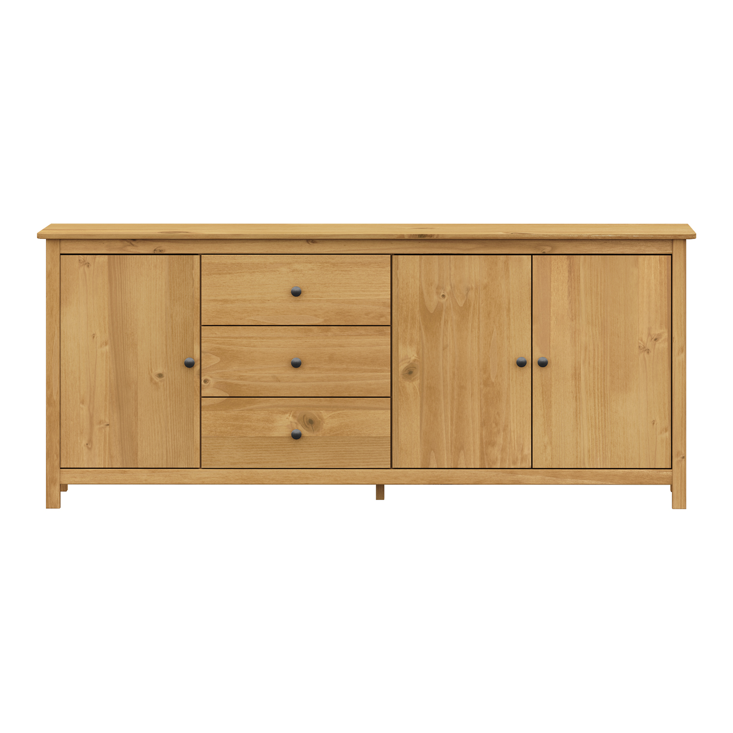 Die Kommode TORINO mit drei Türen und drei Schubladen in gewachster Ausführung ist ein unverwechselbares Möbelstück, das Wärme und Ruhe in den Raum bringt. Sie ist aus massivem Kiefernholz gefertigt, das ihr Stärke, Stabilität und Langlebigkeit verleiht. Die natürliche Maserung des Holzes kommt dank der gewachsten Oberfläche schön zur Geltung und verleiht jedem Stück einen unverwechselbaren Charakter. Die durchdachte Anordnung der Stauräume bietet viel Platz für den täglichen Bedarf. Drei geräumige Schränke bieten den idealen Platz für die Aufbewahrung von Geschirr, Textilien oder anderen Haushaltsgegenständen, die Sie geordnet, aber leicht zugänglich aufbewahren möchten. Drei Schubladen mit Metallführungen eignen sich perfekt für Kleinkram, Dokumente oder andere kleine Gegenstände, die Sie übersichtlich aufbewahren möchten. Das robuste Design wirkt solide und zuverlässig, so dass die Kommode zu einem festen Bestandteil Ihrer Einrichtung wird. Die gewachste Oberfläche hebt nicht nur das natürliche Aussehen des Holzes hervor, sondern schützt es auch vor normaler Abnutzung und macht es leicht zu pflegen. Eine regelmäßige Pflege genügt, damit die Kommode ihr schönes Aussehen auf Dauer bewahrt. Das Möbelstück eignet sich für das Wohnzimmer, das Esszimmer und das Schlafzimmer. Sie schafft überall eine angenehme Atmosphäre und bietet eine praktische Aufbewahrungslösung. Die Kommode TORINO verbindet Funktionalität mit einem traditionellen Look und bringt ein Gefühl von Gemütlichkeit, Ordnung und Stabilität in die Wohnung. Dank ihres zeitlosen Designs wird sie auch nach vielen Jahren noch gut aussehen.