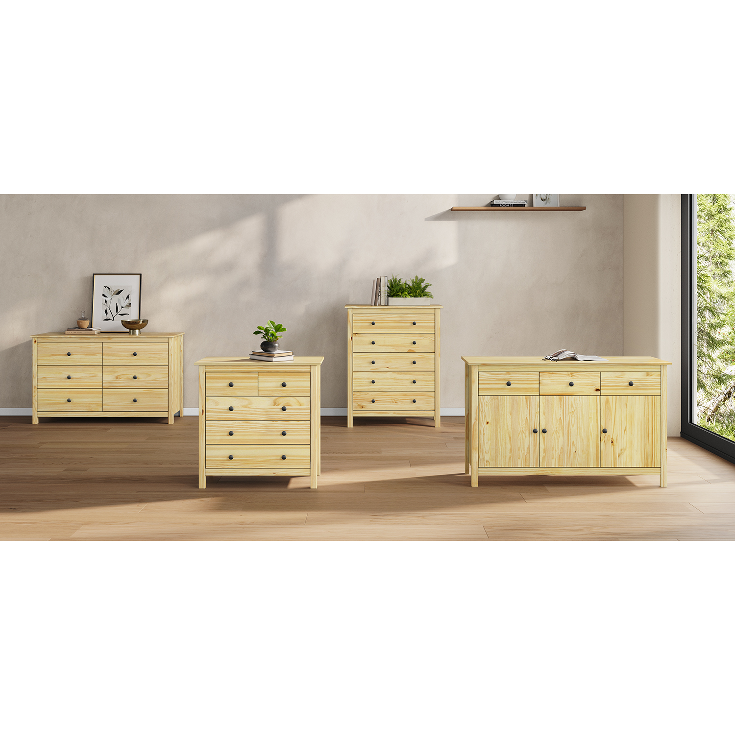 Produktcode: 8090KMaterial Kiefer massiv, lackiertMetallgriffe aus schwarzem Messing2 kleinere und 3 größere Schubladen mit Metallschienen