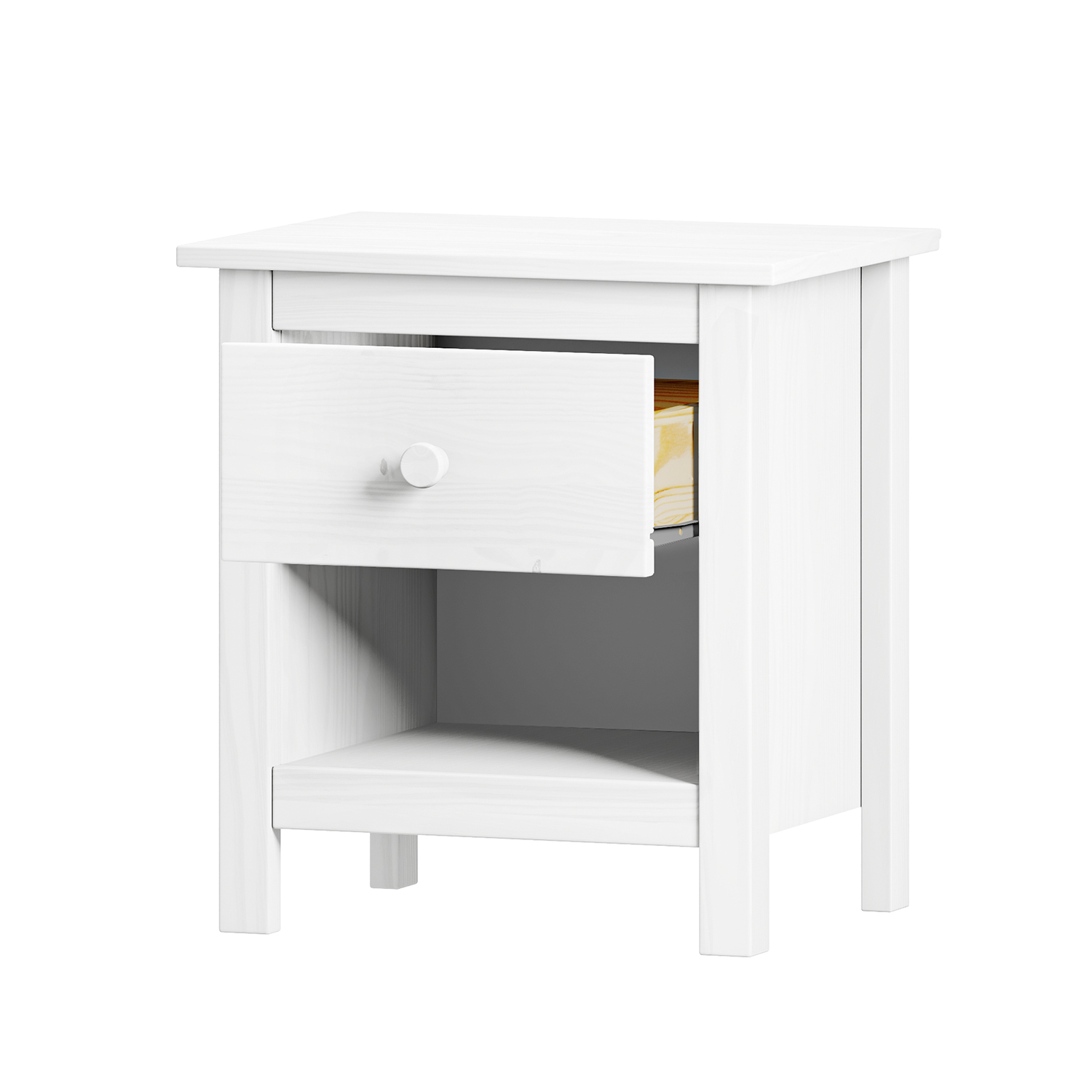 Der weiße Nachttisch TORINO ist ein toller Begleiter für jedes Schlaf-, Kinder-, Gäste- und Studentenzimmer, insbesondere für Räume, die mit Massivholzmöbeln in Lack-weiß ausgestattet sind. Das schlichte Design des Nachttisches mit einer einzigen Schublade mit Metallschienen und offenem Stauraum ist das Beste, was der Nachttisch zu bieten hat. Auf dem praktischen Nachttisch lassen sich problemlos kleine Gegenstände aufbewahren, Tee oder Bücher abstellen sowie ein Wecker und eine Lampe platzieren. Kurzum, der weiße Nachttisch TORINO ist eine tolle Ergänzung zu Ihrem weißen Massivbett. Ein weißes Schlafzimmer mit einem geräumigen Bett und einem praktischen Nachttisch wird Sie dazu verführen, sich zu entspannen und Ihre freie Zeit mit einem interessanten Buch zu verbringen.
