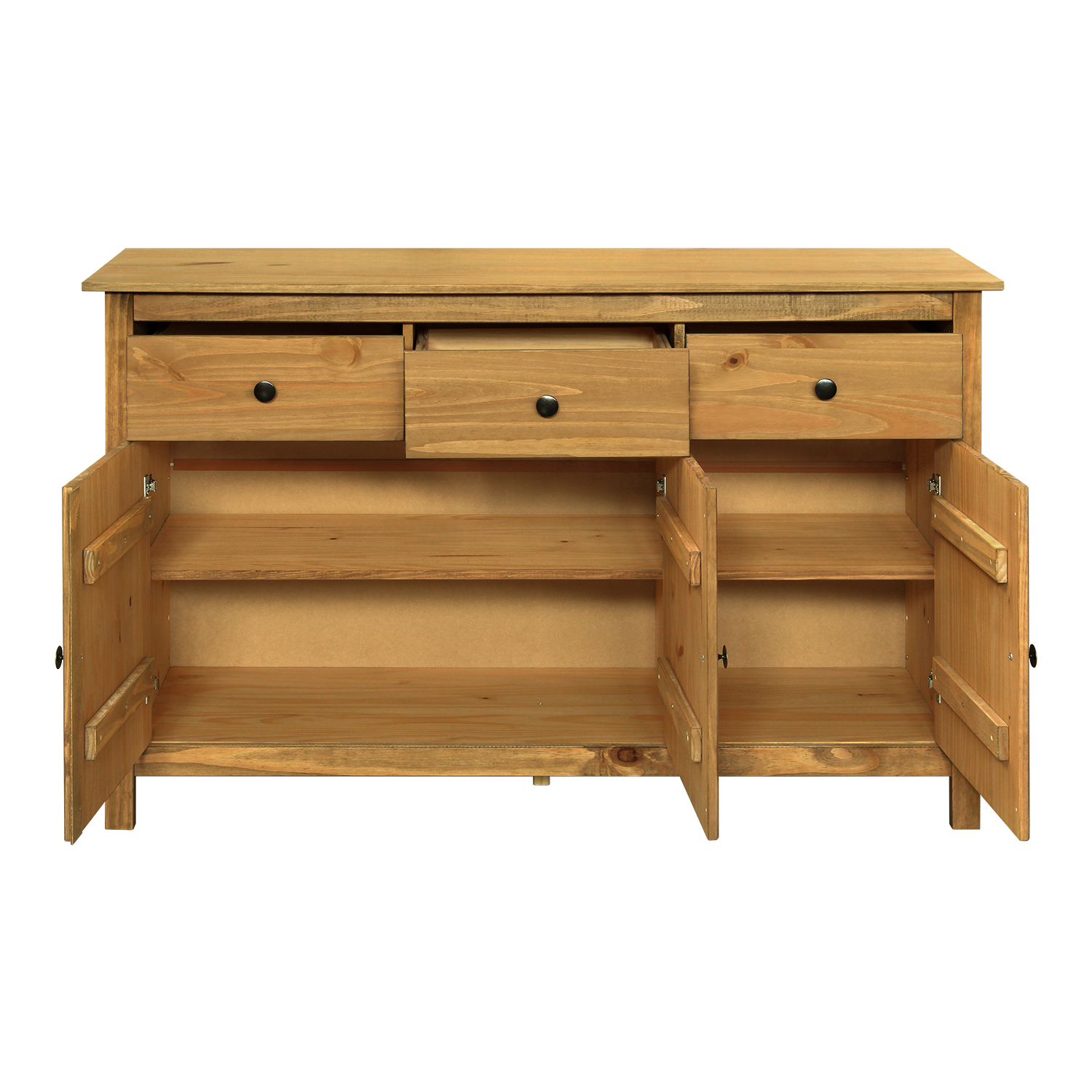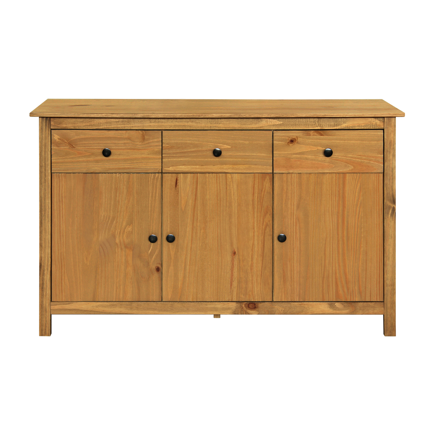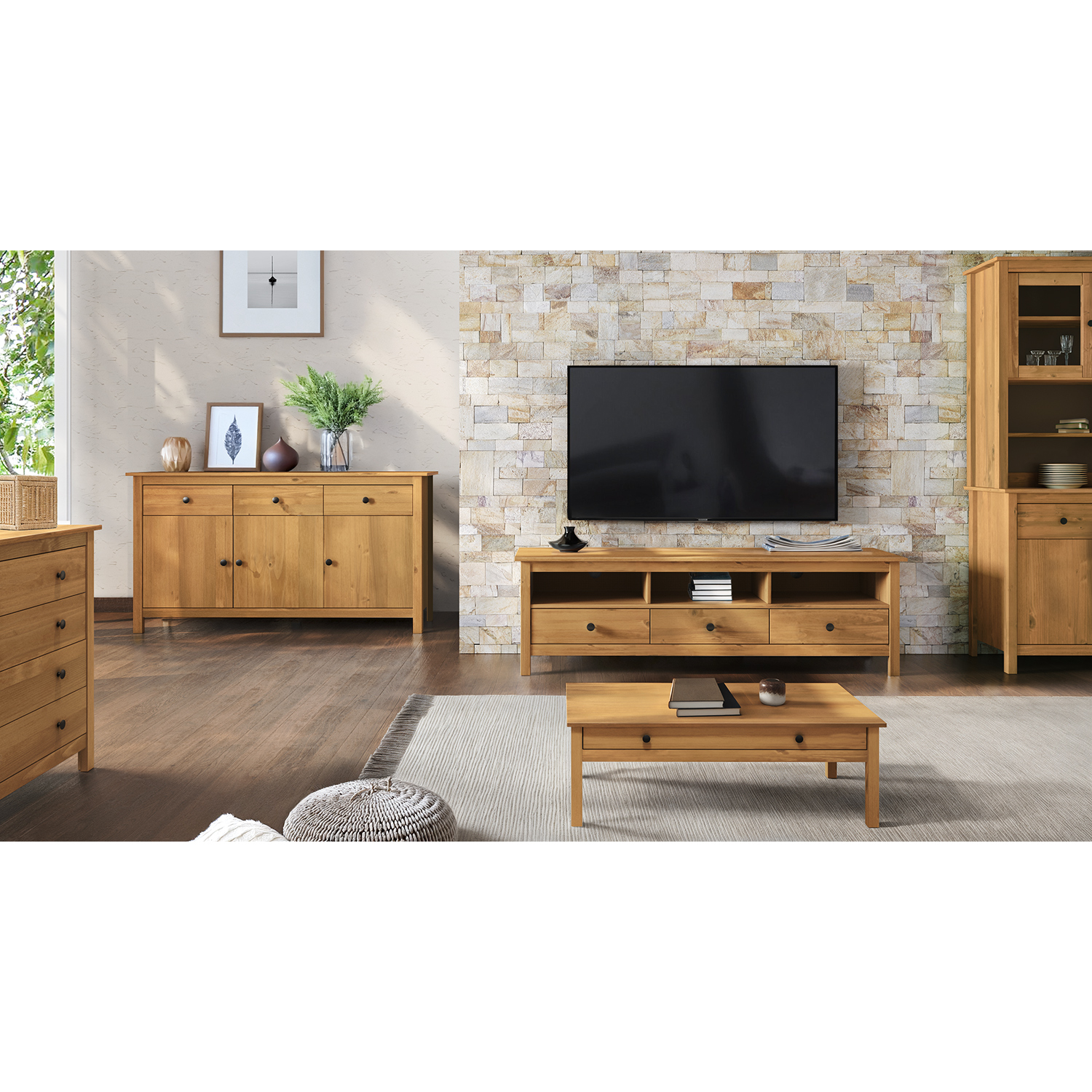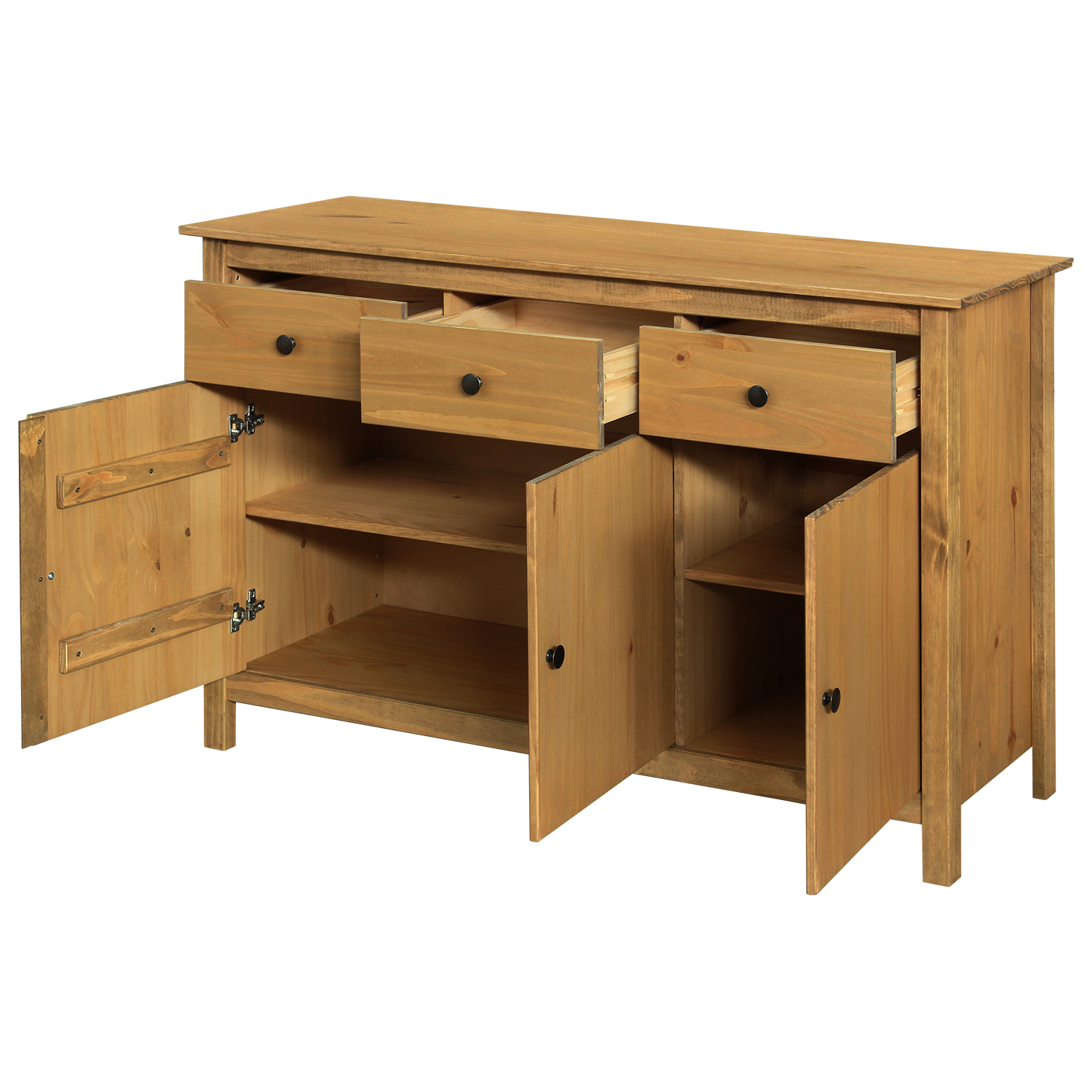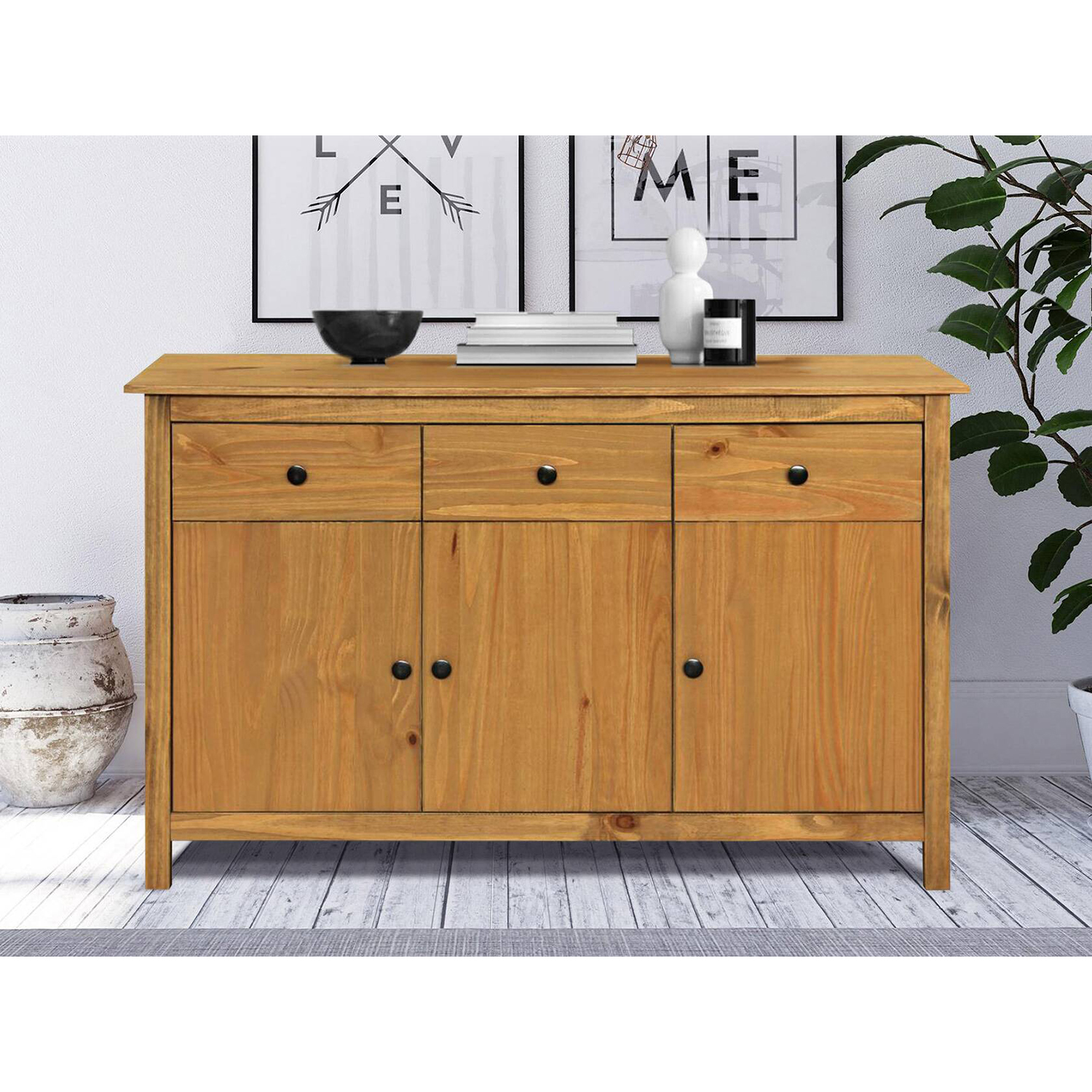 Produktcode: 8061VMaterial massives Kiefernholz gewachst in HonigtonMetallgriffe aus geschwärztem Messing3 Schubladen mit Metallschienen, 3 massive Türen, 2 Einlegebödenmaximale Belastbarkeit in der Montageanleitung angegeben