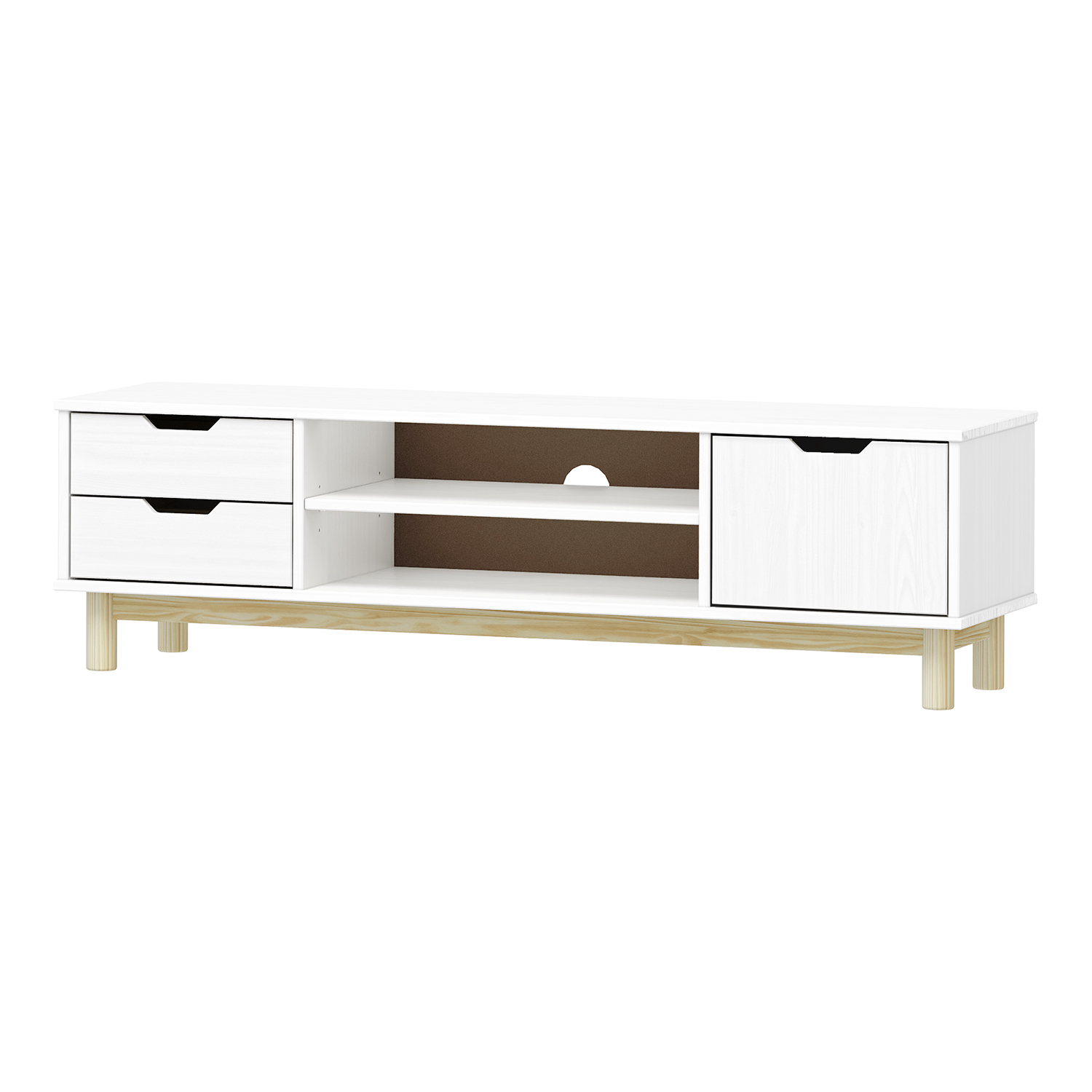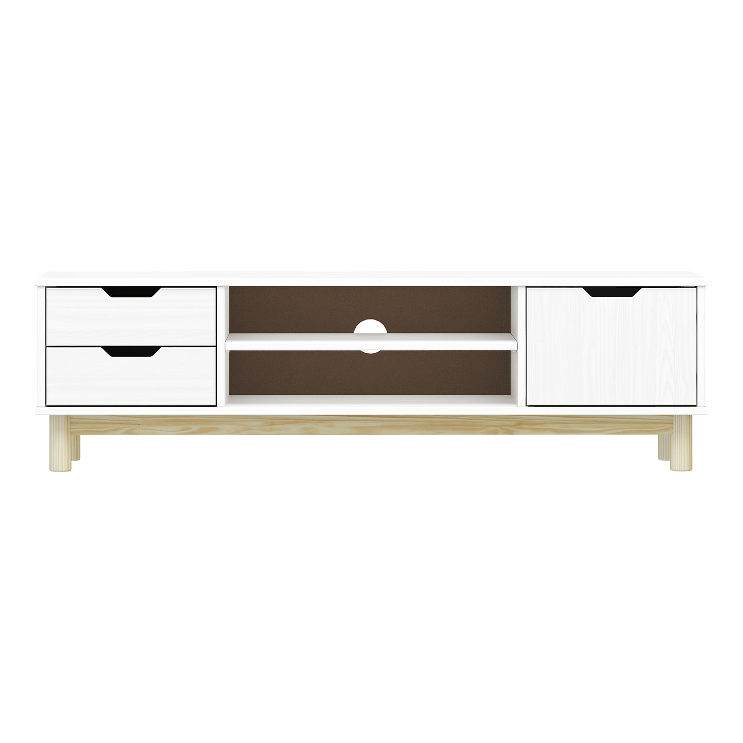 Tento TV stolek Bonito 2 je vyroben z masivu borovice a opatřen bílým lakem, který dodává stolku svěží a elegantní vzhled. Lakovaný povrch chrání dřevo proti drobným oděrkám a zajišťuje snadnou údržbu, takže stolek dlouhodobě zachovává svůj čistý a upravený vzhled. Stolek nabízí praktické úložné prostory, které zahrnují jednu dvířkovou část a dvě zásuvky, takže můžete snadno uspořádat multimediální zařízení, kabely, dálkové ovladače i drobné doplňky. Bílý lakovaný povrch působí lehce a vzdušně, což umožňuje jeho snadnou kombinaci s různými styly interiérů, od moderního minimalismu po skandinávský či klasický design. Elegantní a jednoduché linie stolku doplňují harmonický vzhled obývacího prostoru a přidávají mu sofistikovaný nádech. Pevné nohy z masivu zaručují stabilitu a odolnost, takže stolek vydrží každodenní provoz bez kompromisů. Díky kombinaci masivu a kvalitního laku se stává stolek Bonito 2 nejen praktickým řešením pro TV a multimédia, ale také výrazným estetickým prvkem, který zaujme návštěvy. Je ideální pro každodenní použití, rodinné posezení i domácí relaxaci. Stolek propojuje praktičnost, odolnost a nadčasový design, což z něj činí dlouhodobou investici do stylového a funkčního bydlení. Každý detail je promyšlený a ladí s celkovou koncepcí moderního obývacího prostoru.