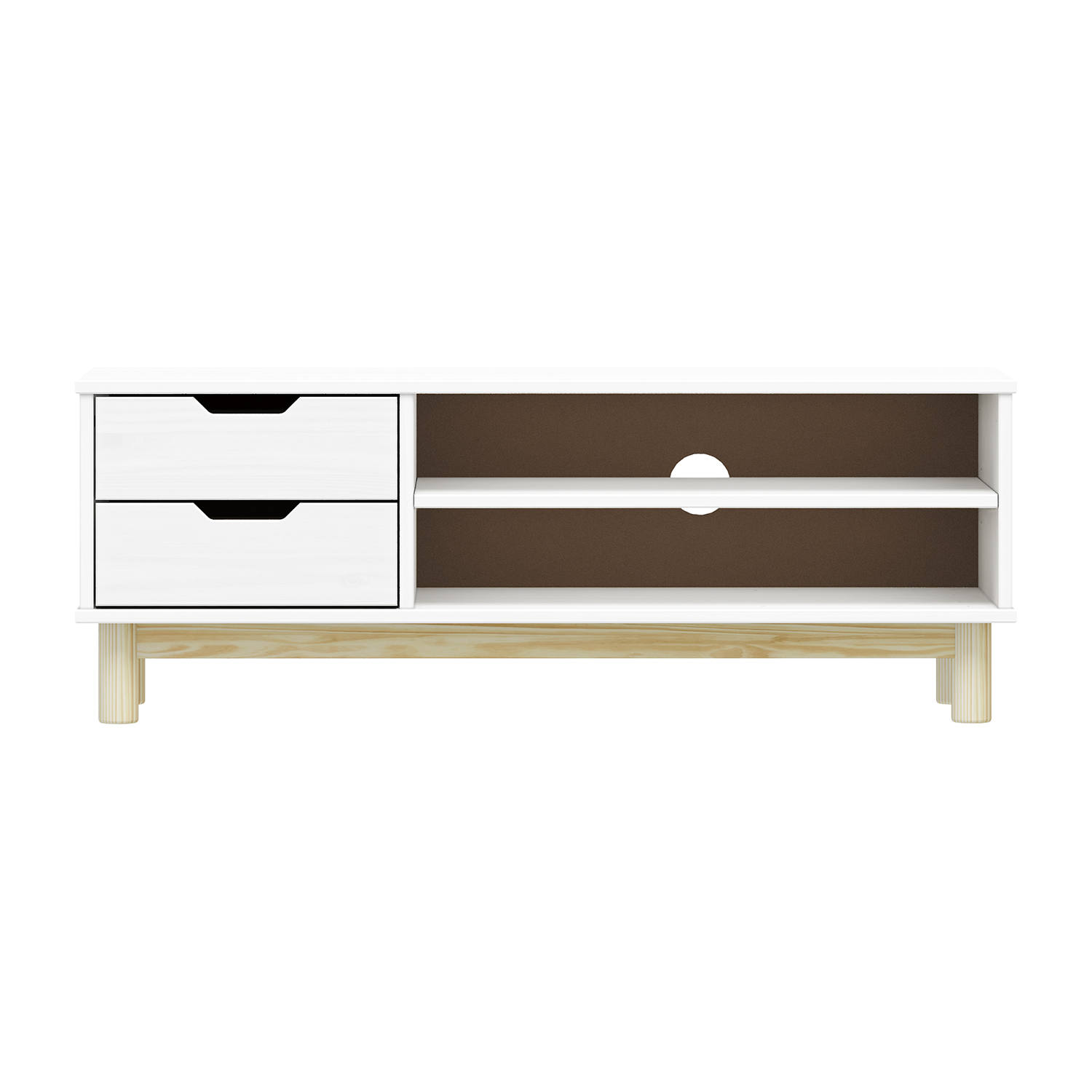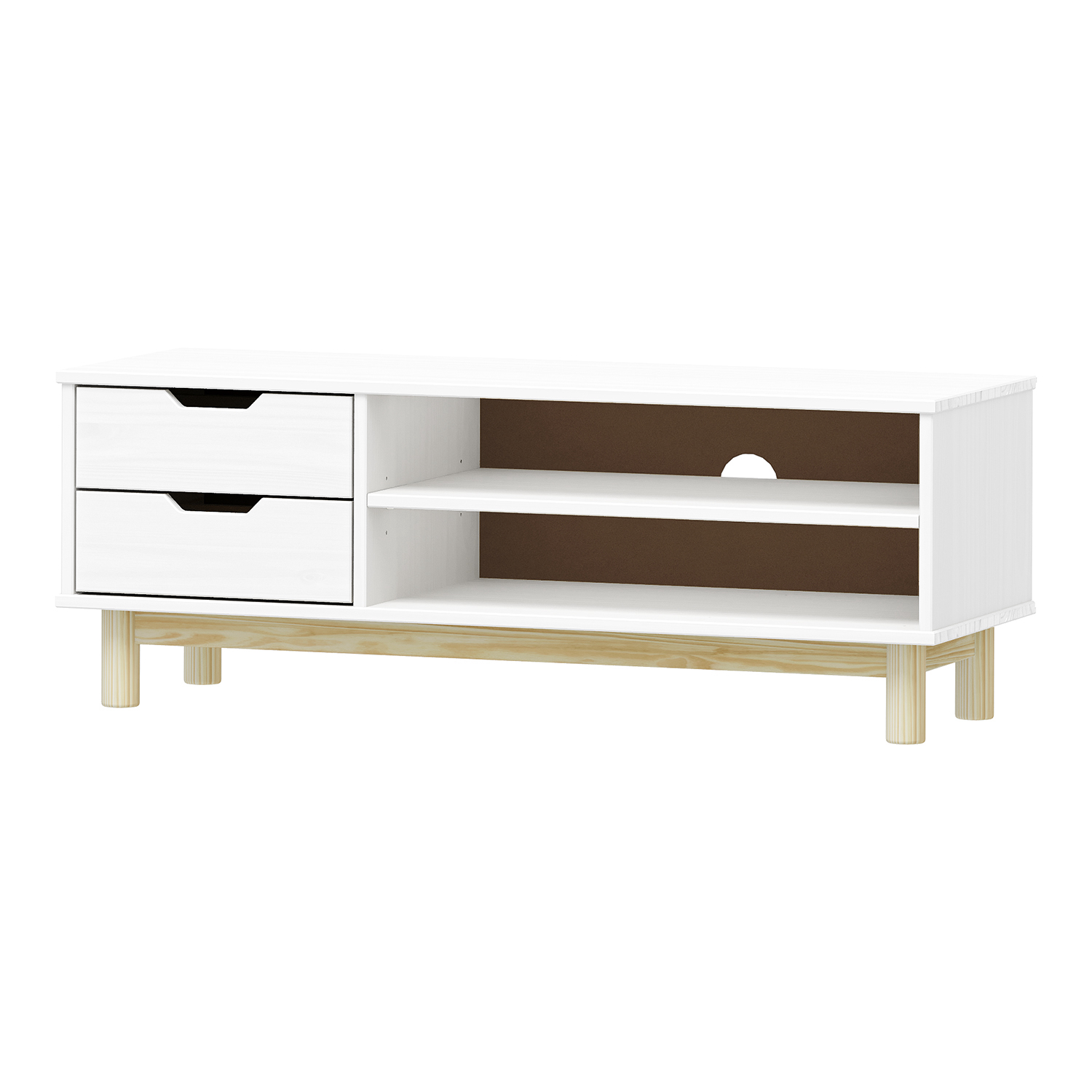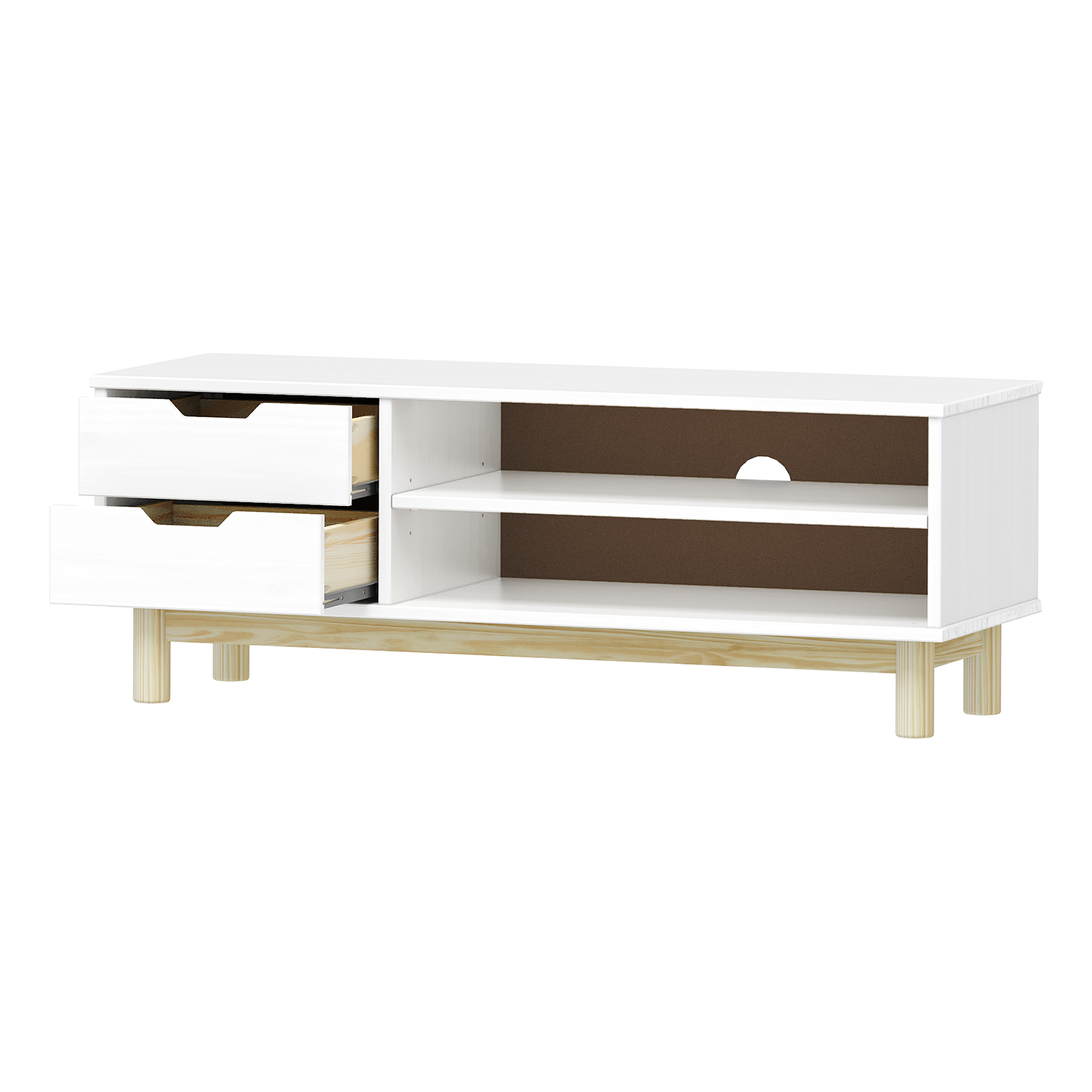 materiál masiv borovice, lakované provedení 2 zásuvky s kovovými pojezdy, 1 dvířka, 1 police otvor na protažení kabelů