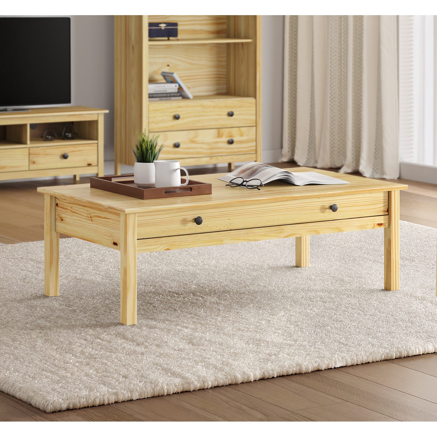 TV stolek TORINO je kus nábytku, který si vás získá svým poctivým provedením a přírodní estetikou. Je vyroben z masivu borovice a lakovaný tak, aby vynikla kresba dřeva, ale zároveň byla zachována jeho odolnost a snadná údržba. Každý detail působí promyšleně a pevně. Hlavní odkládací plocha pojme běžnou televizi i s drobnou dekorací. Pod ní najdete praktické zásuvky a otevřený prostor, kam snadno uložíte elektroniku nebo oblíbené časopisy. Kovové úchytky podtrhují jednoduchý vzhled a zároveň zajišťují pohodlné otevírání zásuvek. Celkový design je nadčasový a lehce venkovský, ale bez zbytečného zdobení. Hodí se jak do moderního interiéru, tak i do chalupy nebo bytu s rustikálními prvky.