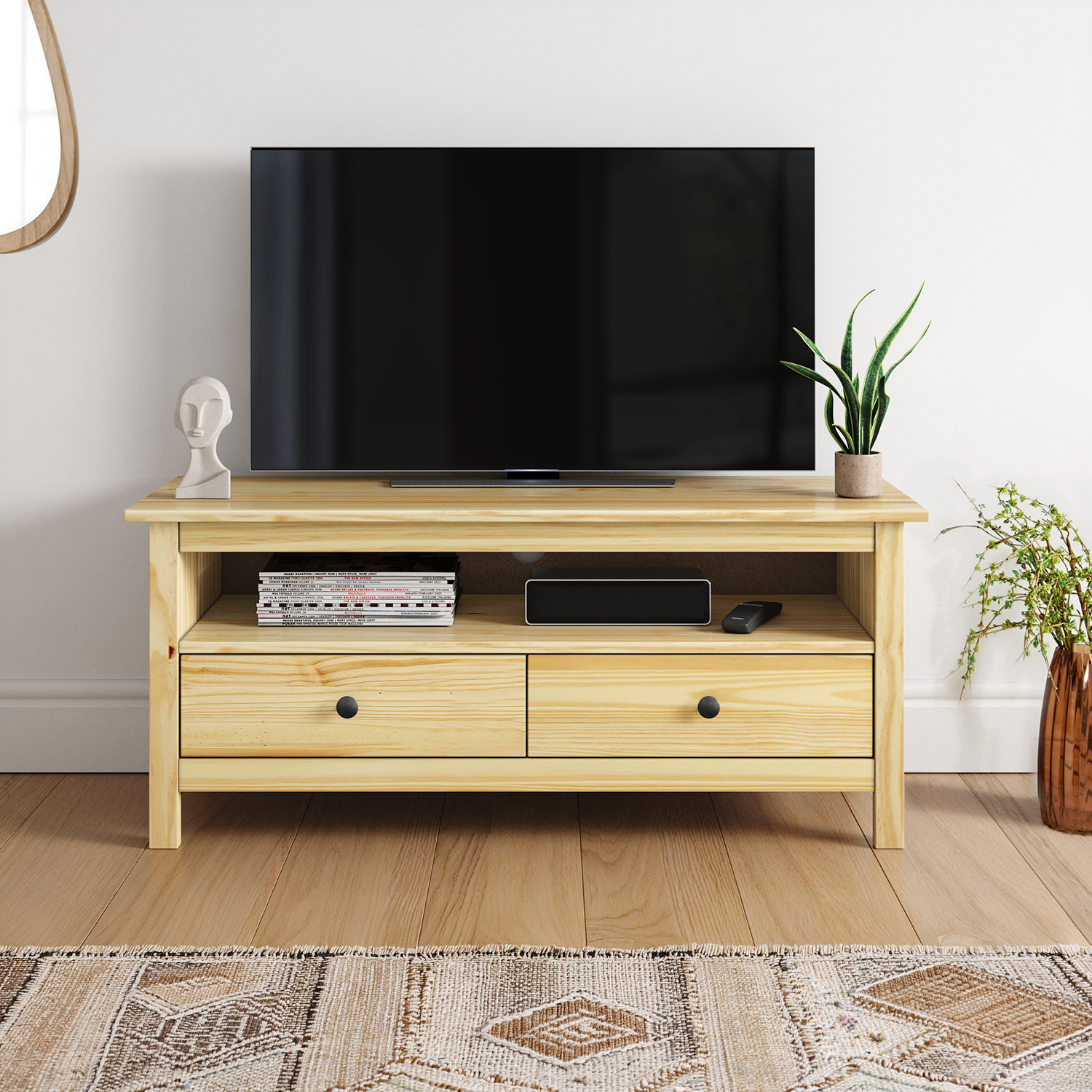 Der Fernsehtisch TORINO ist ein Möbelstück, das genau weiß, was es tut. Er zwängt sich nicht in Trends, sondern wirkt solide, natürlich und selbstbewusst. Massives Kiefernholz in lackierter Ausführung schafft eine warme Basis, die sich nicht mit Plastik oder übertriebenen Verzierungen aufhält. Es ist ein ehrliches Möbelstück, das sowohl Tiefe als auch Charakter hat. Das Holz hat eine Textur, eine Maserung und einen Duft, den keine Imitation erreichen kann. Zwei tiefe Schubladen bieten Stauraum, der nicht gleich bei der ersten großen Veränderung des Lebensstils verschwindet. Egal, ob Sie Ihre Fernbedienungen, Ladegeräte oder alten DVD-Filme darin verstauen, alles hat seinen Platz. Die Metallgriffe dienen nicht der Show, sondern dem sicheren Griff. Sie glänzen so, wie man es von Metall erwartet, und halten genau so, wie man sie braucht. Die obere Platte ist stabil, so dass Sie sich keine Gedanken darüber machen müssen. Ob Fernseher, Lautsprecher, eine Blume oder ein Buch, alles findet auf ihr sein Gleichgewicht. Die Abmessungen sind gut durchdacht, so dass der Tisch nicht wuchtig wirkt, aber dennoch dem täglichen Gebrauch standhält. Er eignet sich nicht nur für den Platz unter dem Fernseher, sondern auch als niedrige Kommode im Wohnzimmer, Arbeits- oder Schlafzimmer. TORINO ist keine Einheitslösung, sondern ein ehrliches Fundament, auf dem man aufbauen kann.
