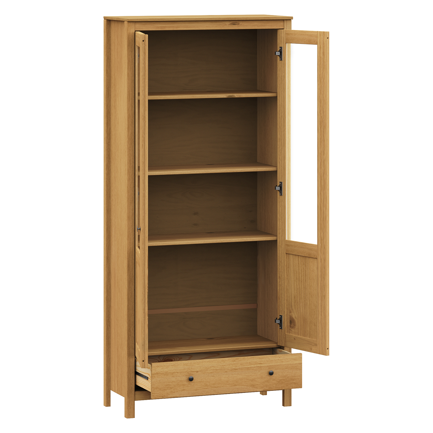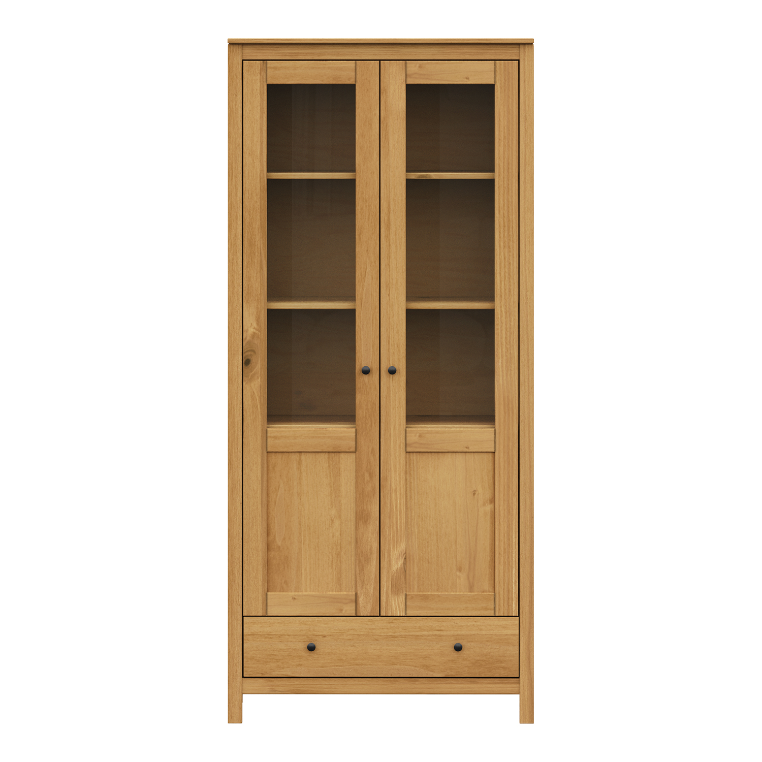 Produktcode: 8060VMaterial massives Kiefernholz gewachst in HonigtonMetallgriffe aus geschwärztem Messing2 Glastüren, 2 Einlegebödenmaximale Belastbarkeit in der Montageanleitung angegeben