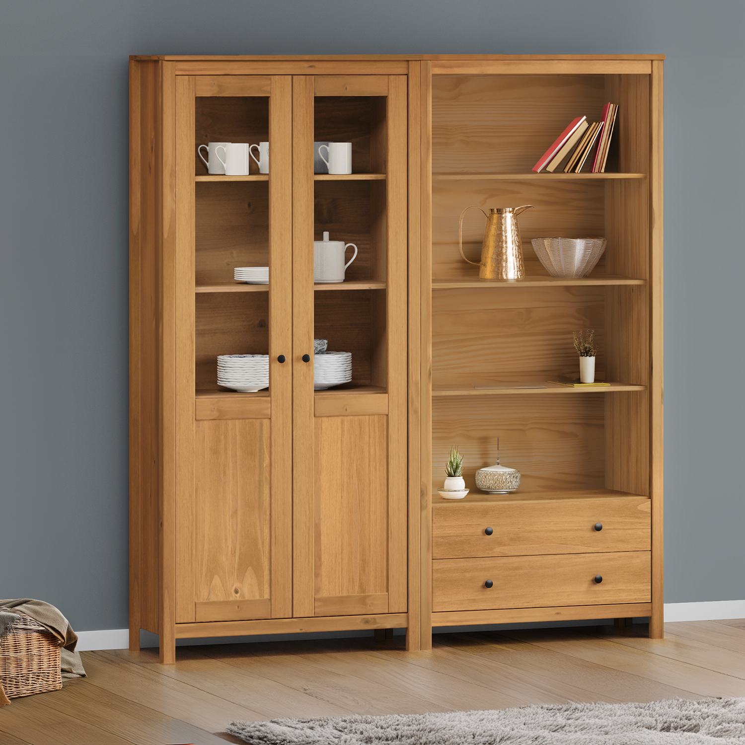 Vitrinen gehören nicht nur in Museen. Auch in Ihrem Wohnzimmer können Sie eine Vitrine mit Ihren eigenen Exponaten haben. Ob Souvenirs von Ihren Reisen, Erinnerungen aus Ihrer Kindheit oder sogar eine Mineraliensammlung. In der Vitrine TORINO 8072V ist für alles Platz. Die Vitrine ist aus massivem Kiefernholz gefertigt, honigfarben gewachst und mit Metallgriffen versehen. Die Türen sind nur oben verglast, so dass Sie die Exponate, die nicht zu sehen sein sollen, unten aufbewahren können. Sie werden keinen Staub darauf bekommen. Sie können die TORINO-Wachsvitrine in einem Set mit anderen TORINO-Möbeln in Wachsausführung aufstellen. Sie werden durch nichts eingeschränkt, nur durch die Abmessungen Ihres Zimmers.